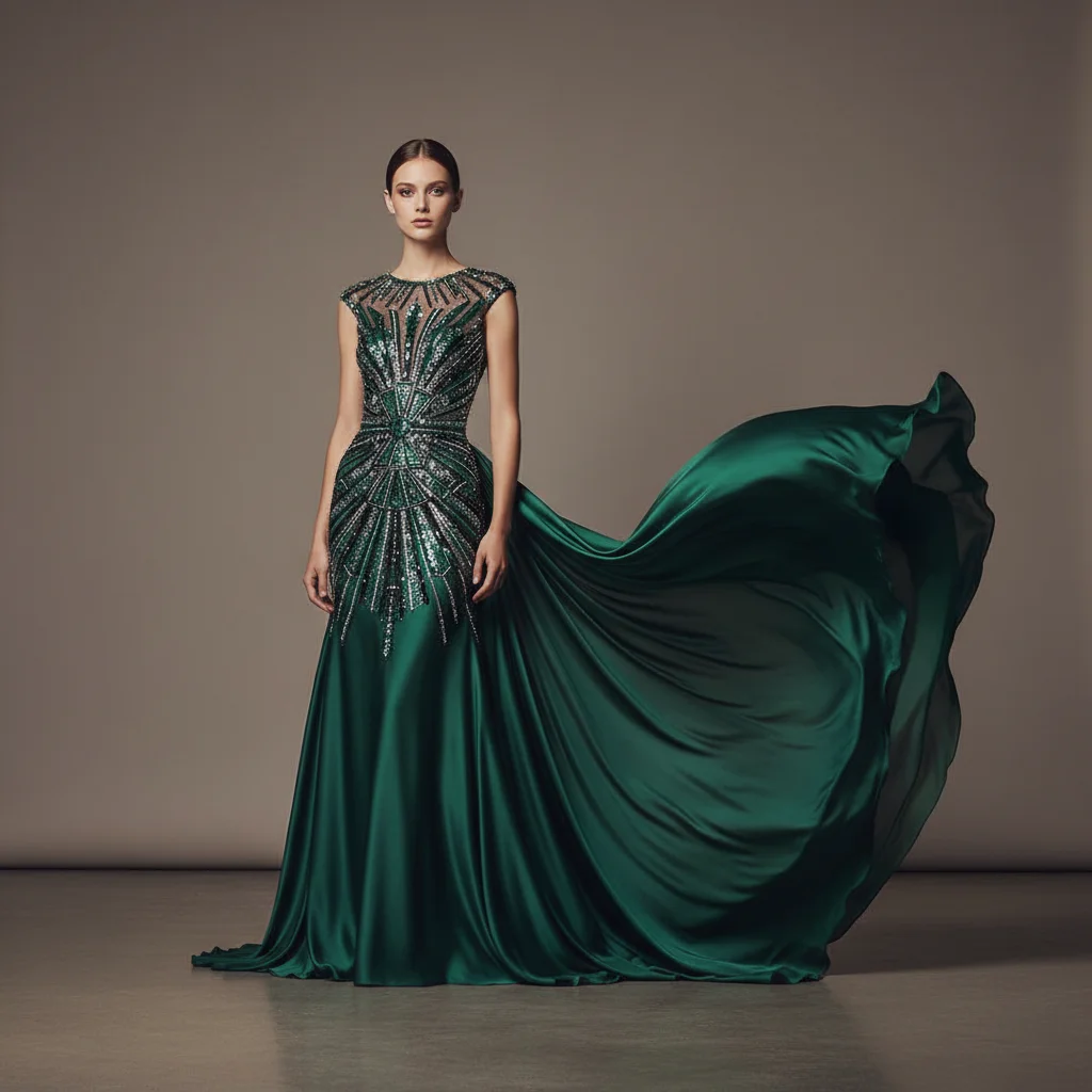 A striking emerald green satin gown with a dramatic, flowing train is showcased on a model against a neutral background. The bodice features intricate silver embellishments and beadwork arranged in a geometric, art deco-inspired pattern, creating a luxurious and elegant silhouette.
