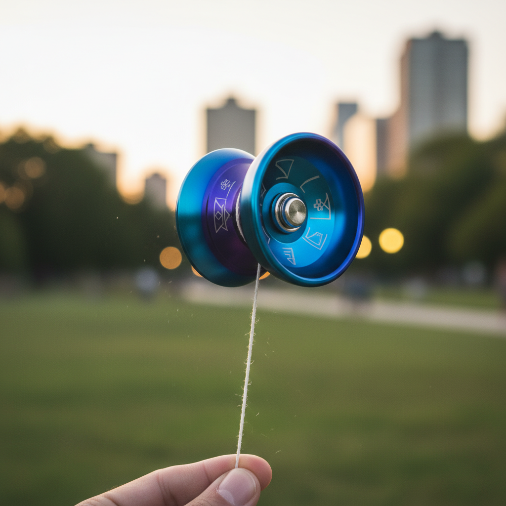 A detailed close-up shot features a vibrant, iridescent yo-yo held by a hand, with a blurred cityscape and park in the background during golden hour. The yo-yo displays intricate engravings and a metallic sheen, set against the soft bokeh of city lights and greenery.
