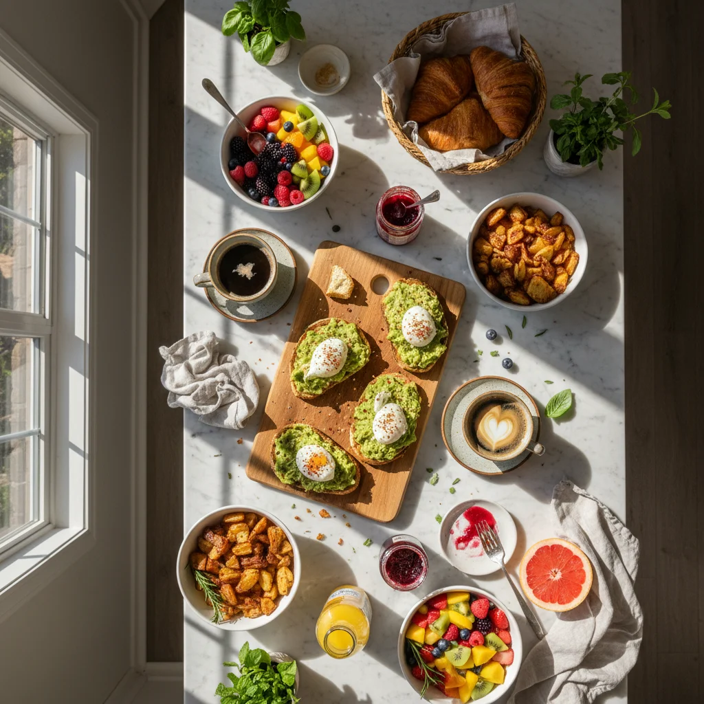A beautifully arranged breakfast spread bathed in natural light, featuring avocado toast with poached eggs, fresh fruit salad, croissants, coffee, and roasted potatoes. The scene is set on a marble surface, creating a sophisticated and inviting atmosphere.