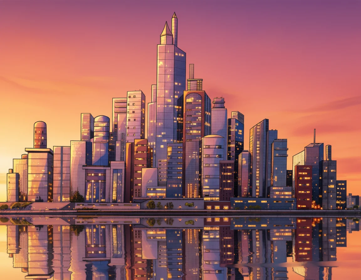A vibrant, stylized illustration depicts a sprawling cityscape dominated by modern skyscrapers. The buildings, rendered with bold outlines and flat colors, are illuminated by the warm glow of a sunset, with lights twinkling in many windows. A calm body of water in the foreground perfectly mirrors the scene, doubling the visual impact of the urban landscape.