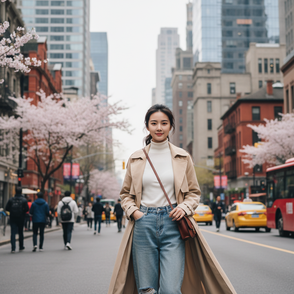 A young Asian woman stands confidently on a city street, wearing a beige trench coat and jeans. She is surrounded by blooming cherry blossom trees, with tall buildings and yellow taxis in the background. The scene evokes a feeling of spring in an urban environment.