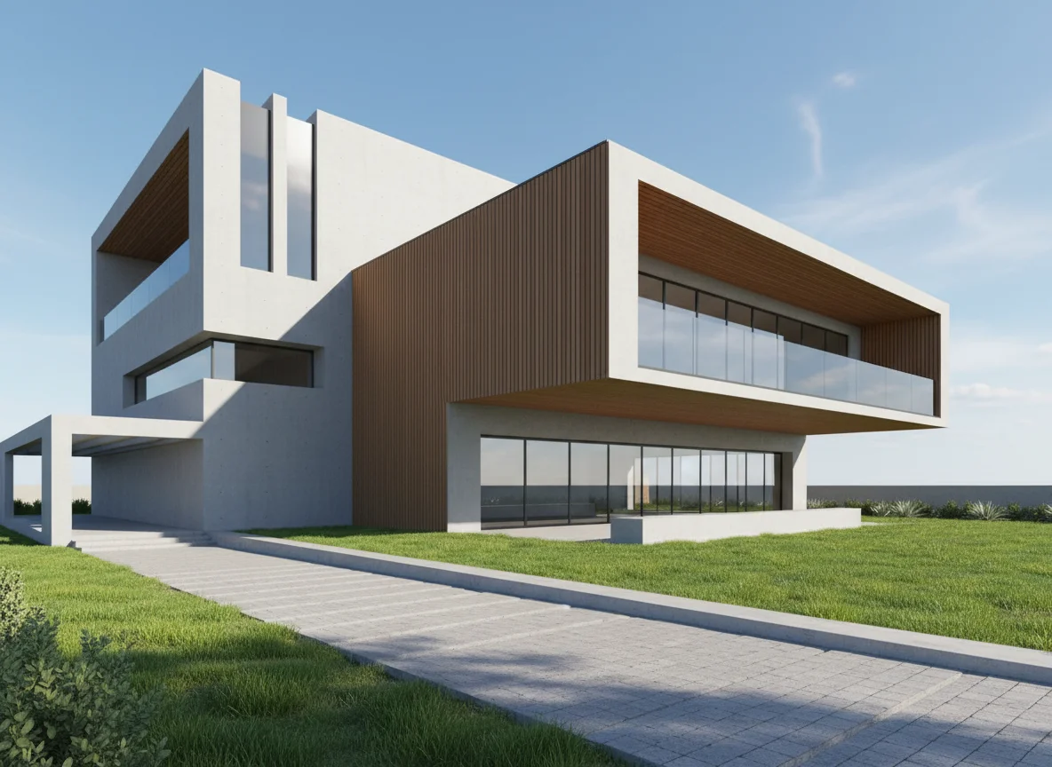 A striking modern house featuring sharp geometric lines, a combination of smooth concrete and warm wood paneling, and expansive glass windows. The architectural design is complemented by a lush green lawn and a clear blue sky.