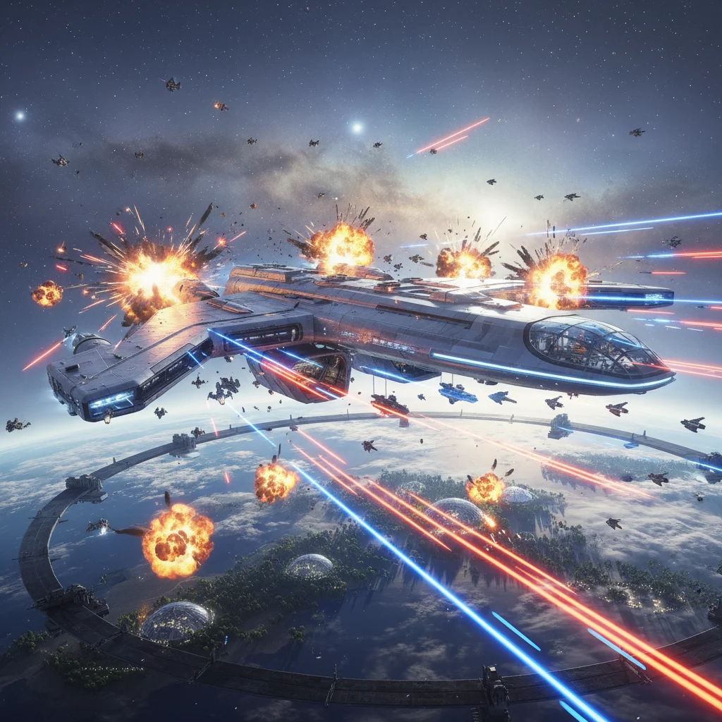 A massive interstellar war unfolds in orbit above a futuristic Earth, with a colossal spaceship at the center of the conflict. Explosions erupt across the battlefield, illuminated by the vibrant red and blue energy beams of laser fire crisscrossing the starry expanse.