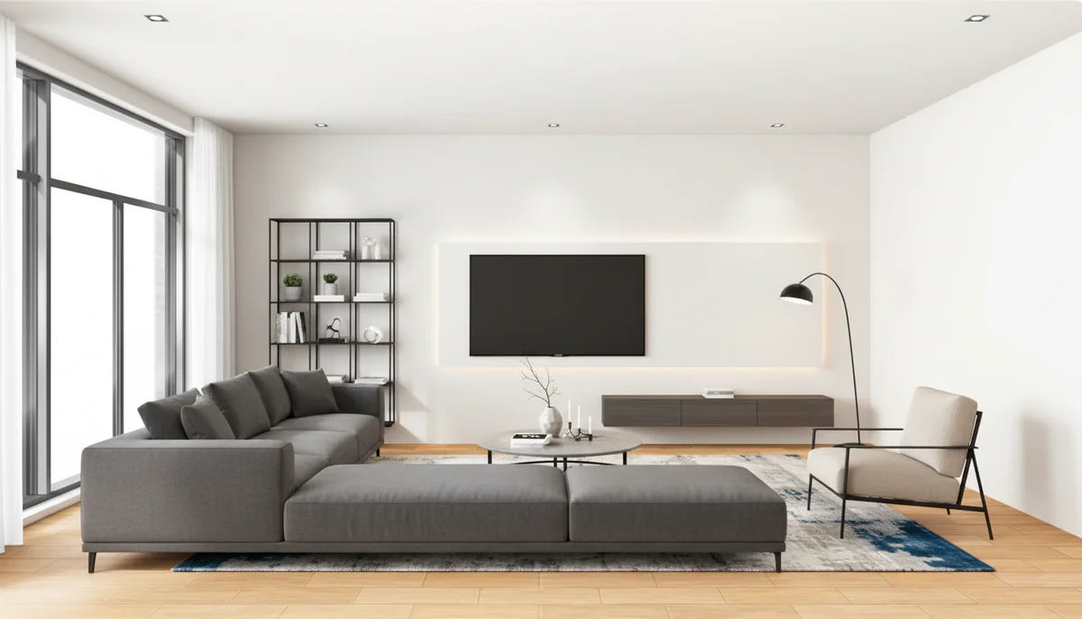 A spacious and contemporary living room features a large sectional sofa in a neutral grey, complemented by a sleek entertainment center and a minimalist armchair. The room is illuminated by abundant natural light from a large window and subtle ambient lighting, creating a bright and inviting atmosphere.