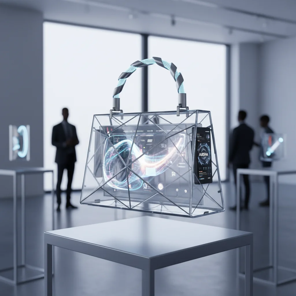 A transparent, geometric handbag with a swirling digital display inside is showcased in a modern, minimalist gallery. The handbag's handle features a braided, metallic design with glowing blue accents, and a digital screen displays the text 'AUSIMA' on its side. Silhouettes of people observe the exhibit in the background.