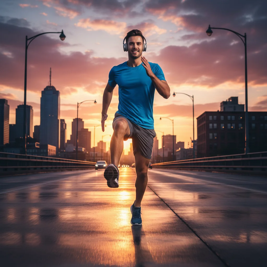 A man is captured mid-stride while running across a bridge in a city during sunset. The sky is painted with warm hues of orange and pink, reflecting on the wet road surface, creating a vibrant and energetic atmosphere.