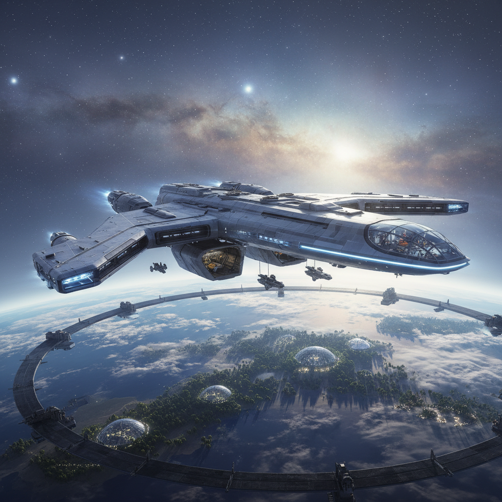 A large, futuristic spaceship with glowing blue accents hovers in orbit above a lush, green planet. Below, a circular space station encircles a continent dotted with geodesic domes and dense forests. The scene is bathed in the warm glow of a distant sun, with stars and nebulae visible in the background.