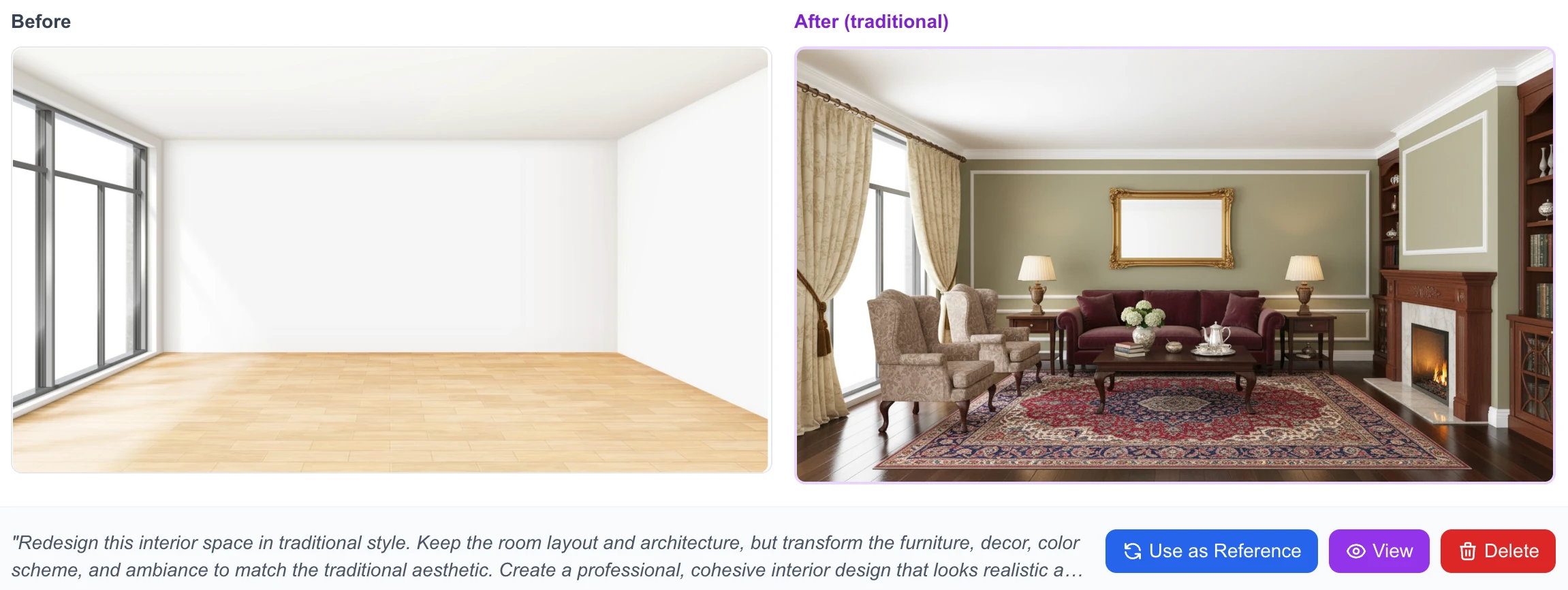 Transform empty spaces into elegant traditional living rooms featuring rich wood furniture, ornate details, and classic color palettes. The AI adds sophisticated elements like oriental rugs, crown molding, and timeless decor.