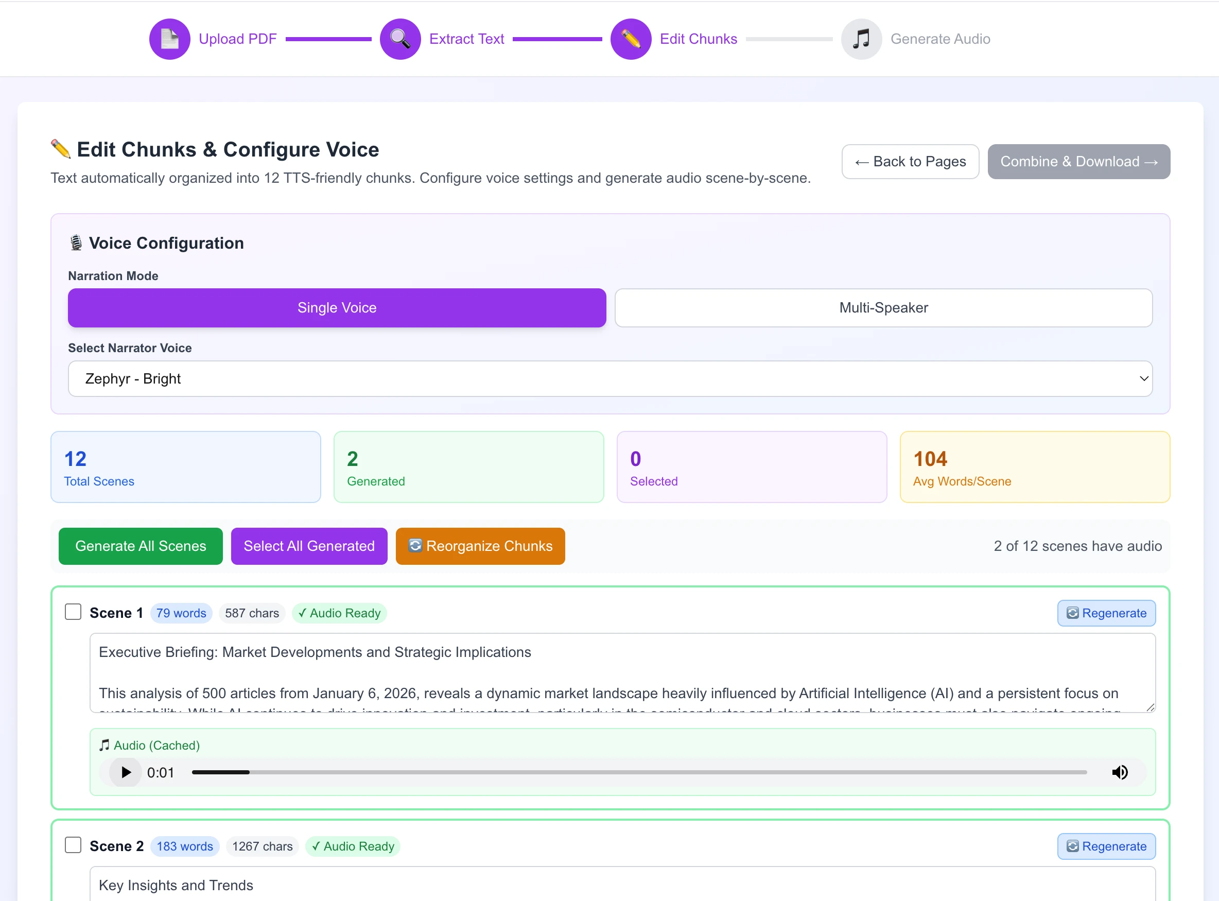 Upload your PDF, organize content into scenes, select from premium AI voices, and customize narration settings all in one intuitive workspace. Our advanced editor lets you preview, edit, and fine-tune every aspect of your audiobook.