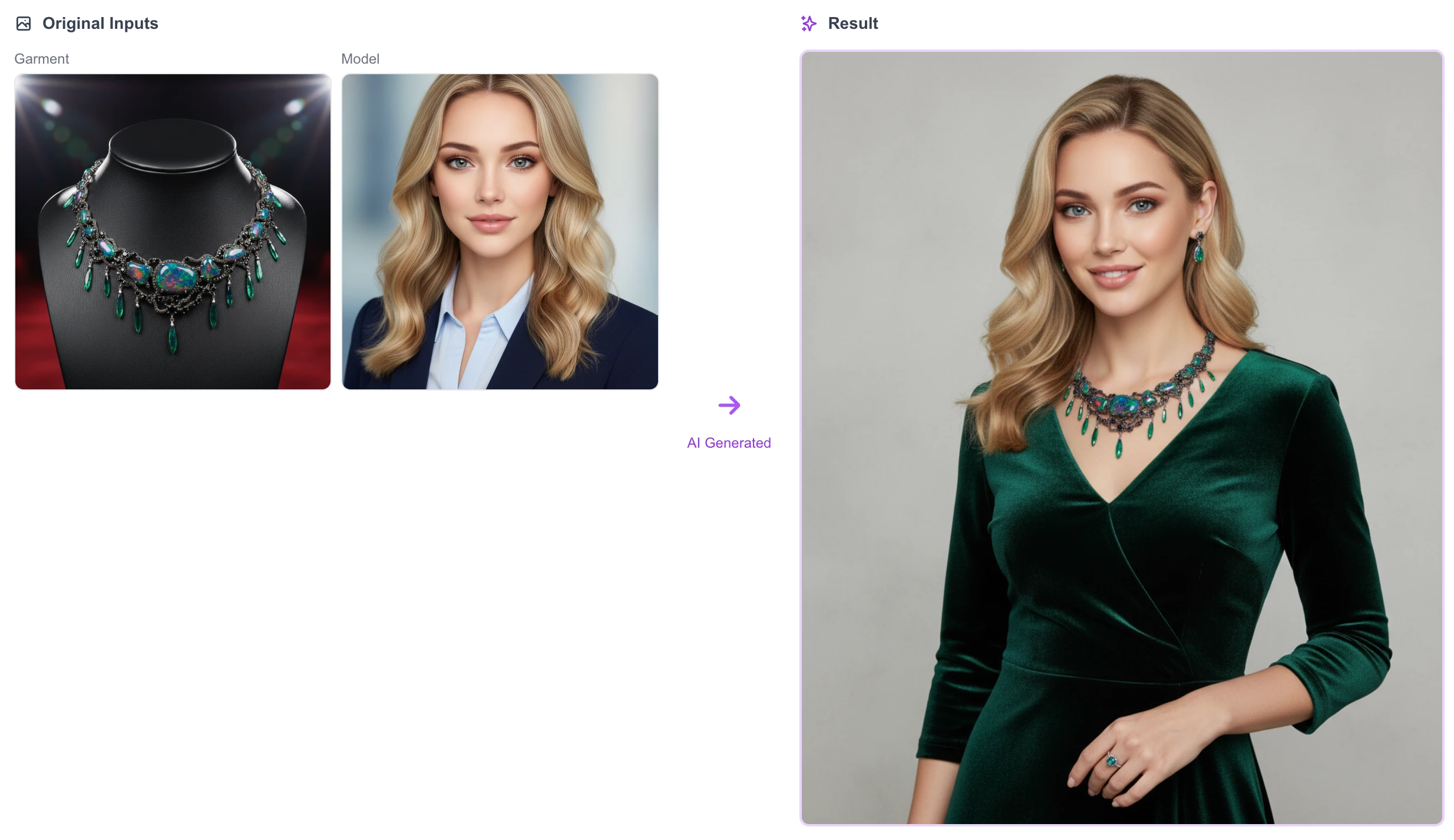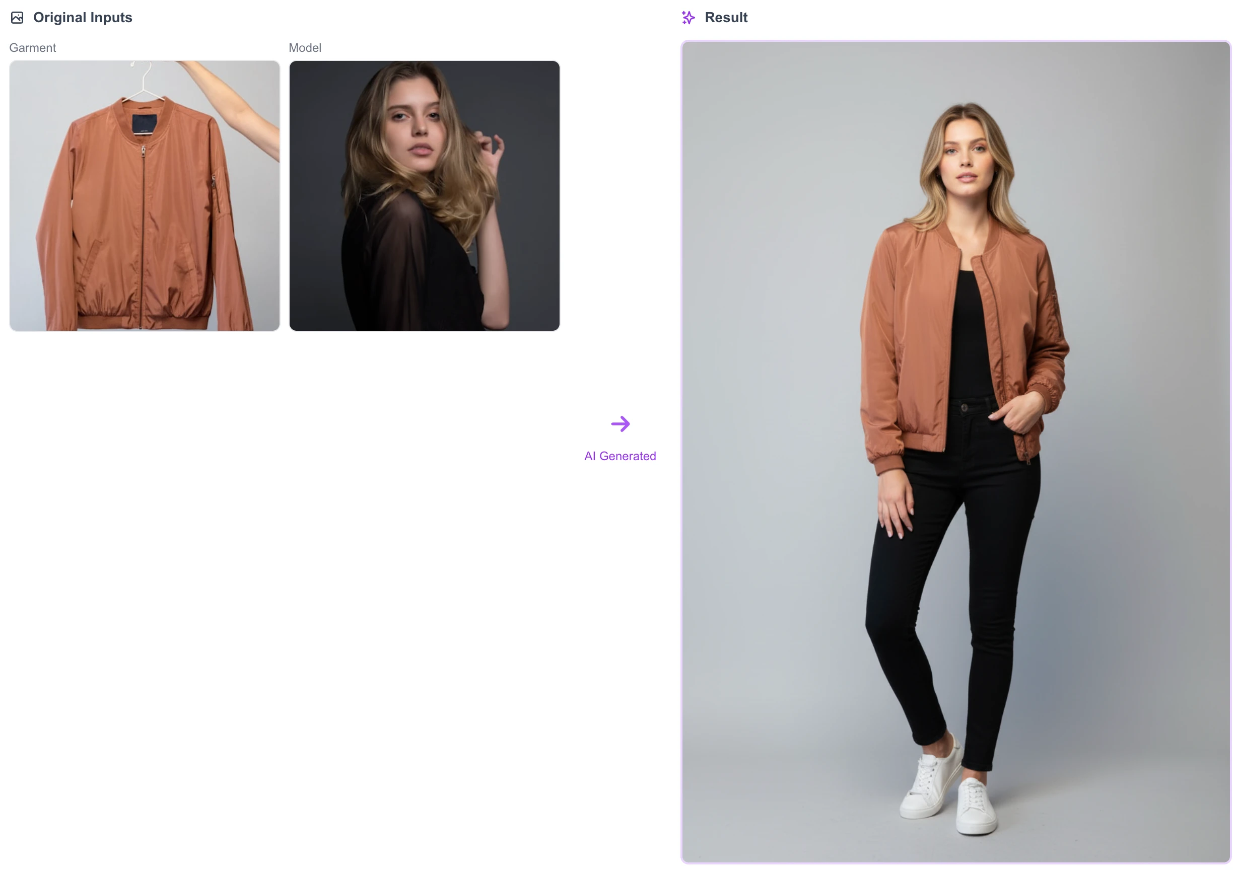 Transform your clothing catalog with AI-powered virtual try-on technology. Upload any jacket, shirt, or dress and see it instantly visualized on your model with realistic lighting, fabric texture, and natural fit.